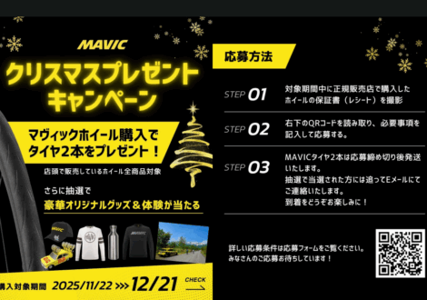 12/21(日)までの期間中、MAVICホイールをご購入頂いた“すべての方”に、販売価格 21,000円(2本分)の高性能チューブレスタイヤ「MAVIC Yksion P……read more