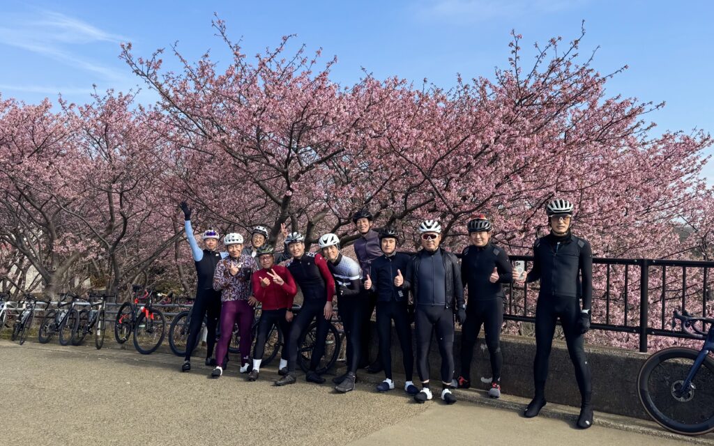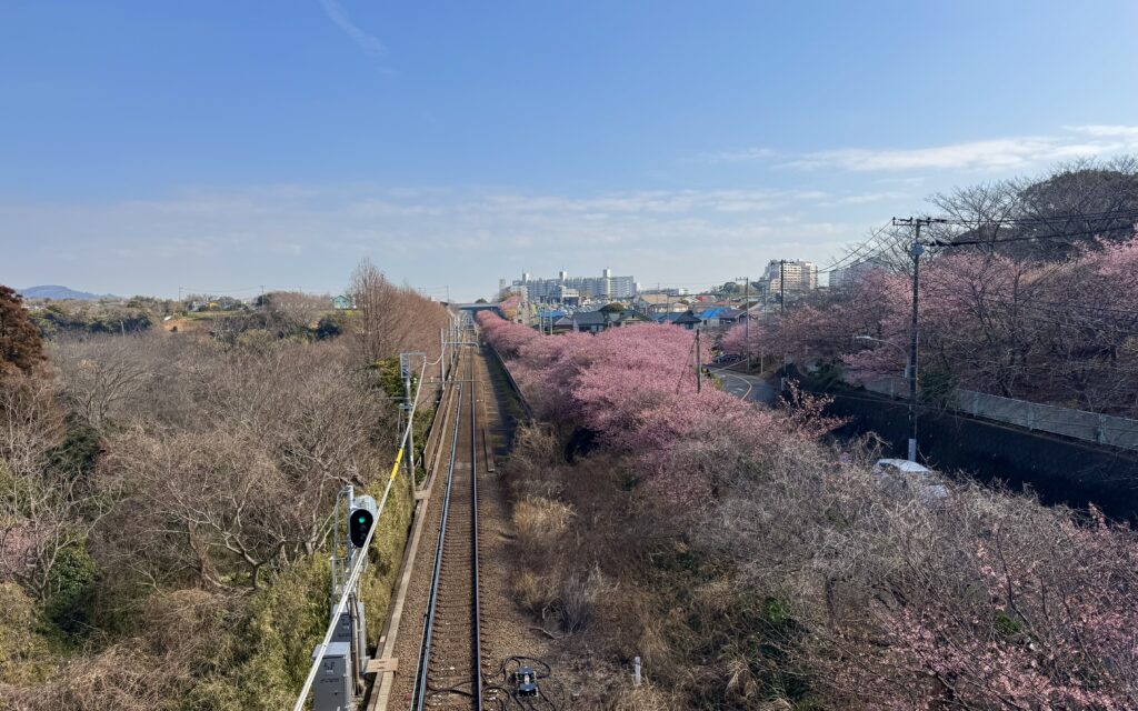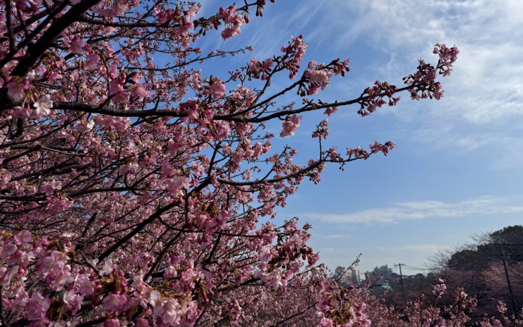 道中では、ちょうど見頃を迎えた河津桜が私たちを迎えてくれました。濃いピンクの花が青空に映え、思わず足を止めて写真タイム。