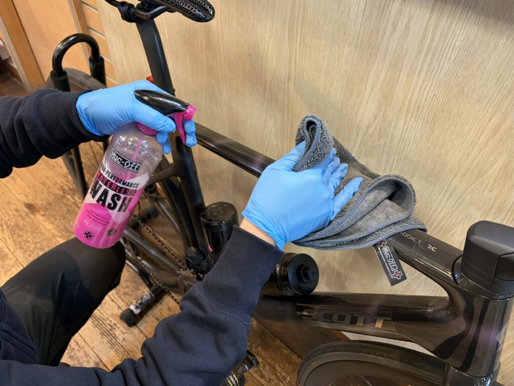 バイク全体にスプレーを噴射し、少し時間を置いてからマイクロファイバークロスで拭き上げるだけ。