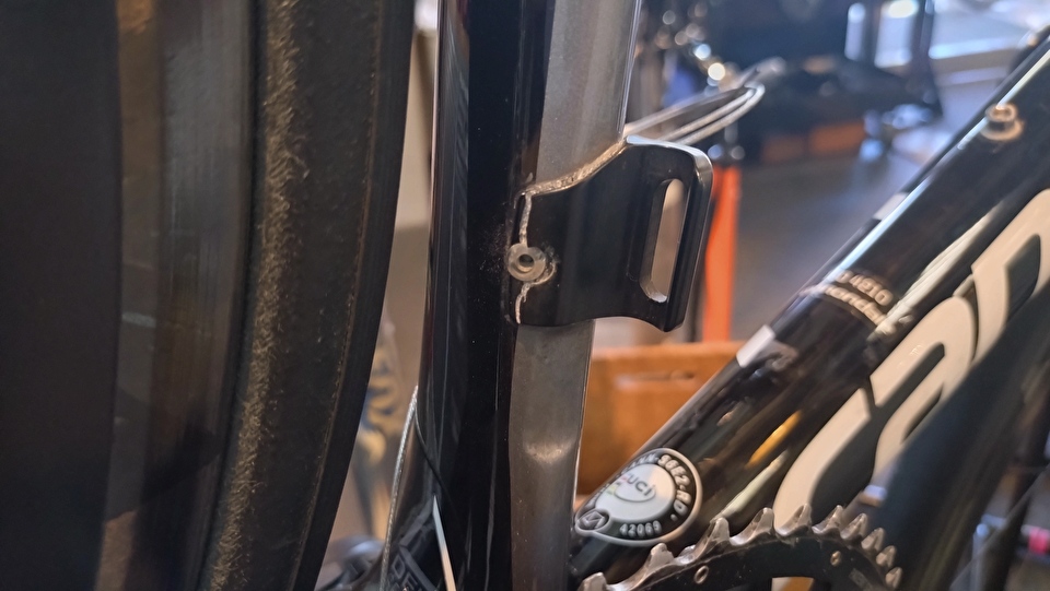 フロントの変速がどうにもこうにも決まらないということで、パーツを外して点検を行ったところ、ディレーラー台座が割れてしまっていました。