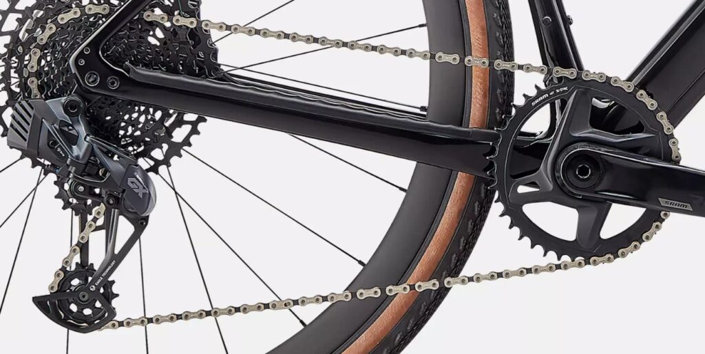 ワイヤレス変速のSRAM Rival eTap AXSを搭載。なんと、ギアはワイヤレスで変速します。操作を意識させないほどスムーズなシフト感で、何度も操作したくなるキレのよさ。