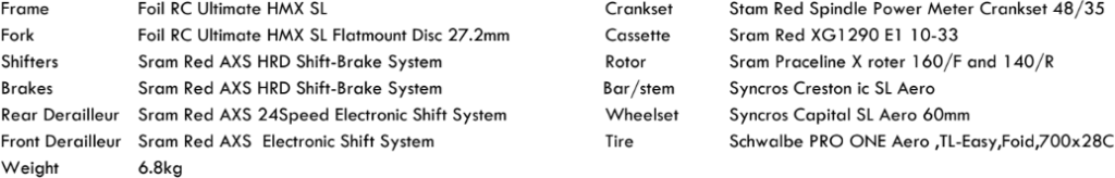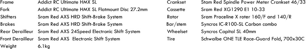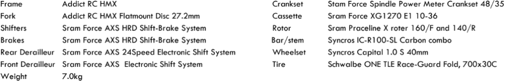 コンポーネントは最新のSram Red AXSに、ホイールは超軽量Syncros Capital SL 40mm(実重量1,125g)と、申し分ないパッケージ。