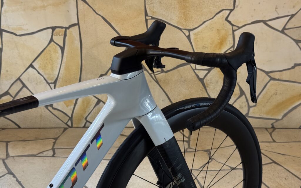 昨今のロードバイクはケーブルの完全内装化に伴い、専用コックピット(またはステム)を使用する事が殆どですが、上記画像のようにステム/ハンドル一体型のカーボン製コックピットとなると、そのパーツだけで軽く10万円オーバーです。
