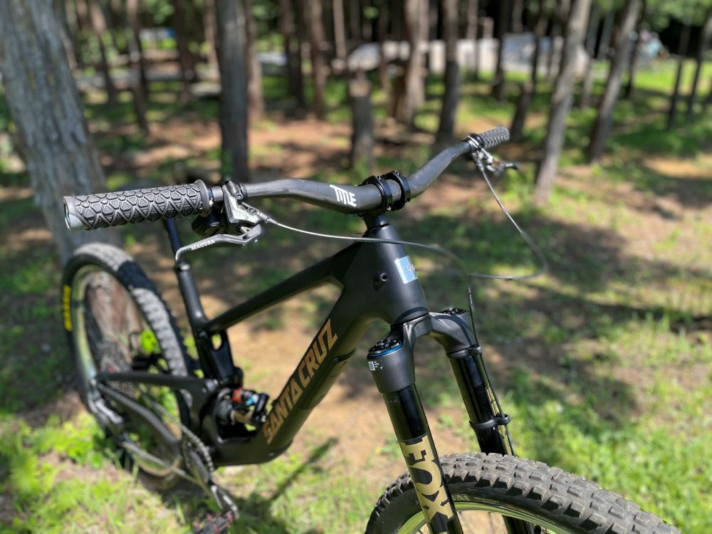 800mmのワイド幅と絶妙なスイープ角で、コントロール性は抜群。疲れにくいから、1本のトレイルが何倍も楽しく感じる。あの手のつかれる感じが無くなりました!