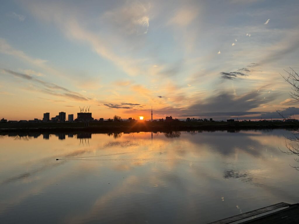 2時間ほどで日が沈み始め、スカイツリーと夕日が重なる撮影スポットには多くのカメラマン。